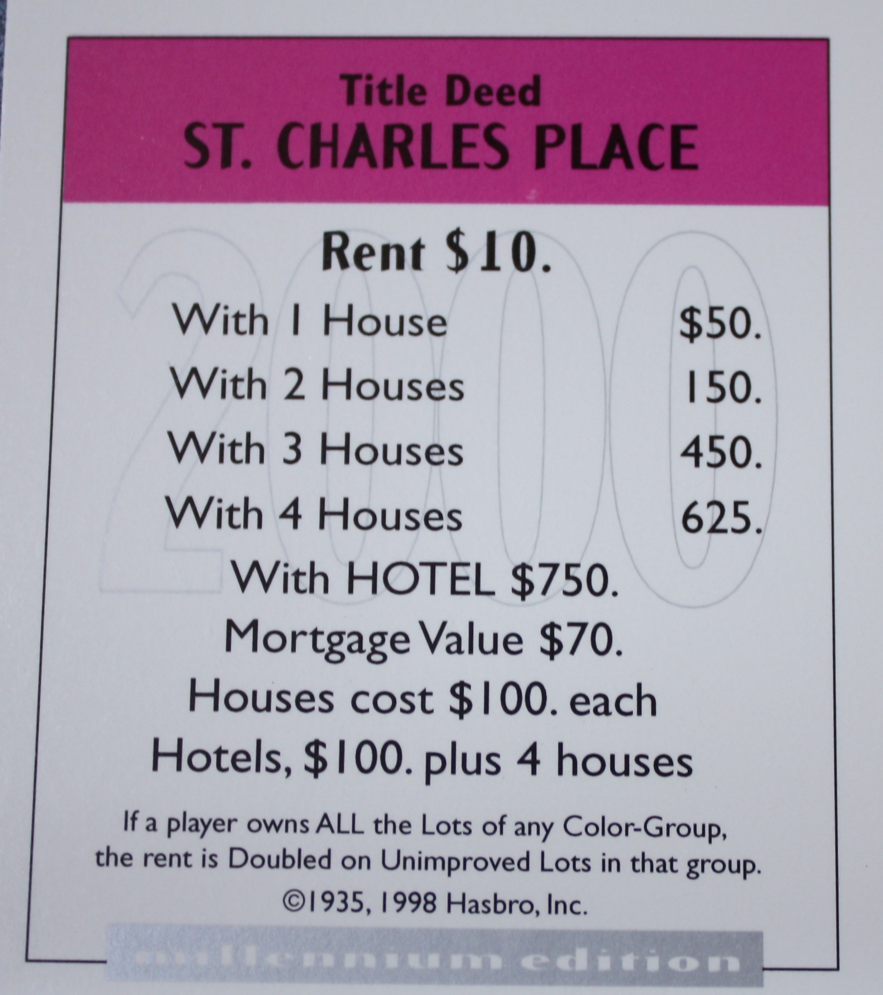 PARTS ONLY – Monopoly Board Game 2000 Millennium Tin Edition – (1) St Charles Place Title Deed Card Only