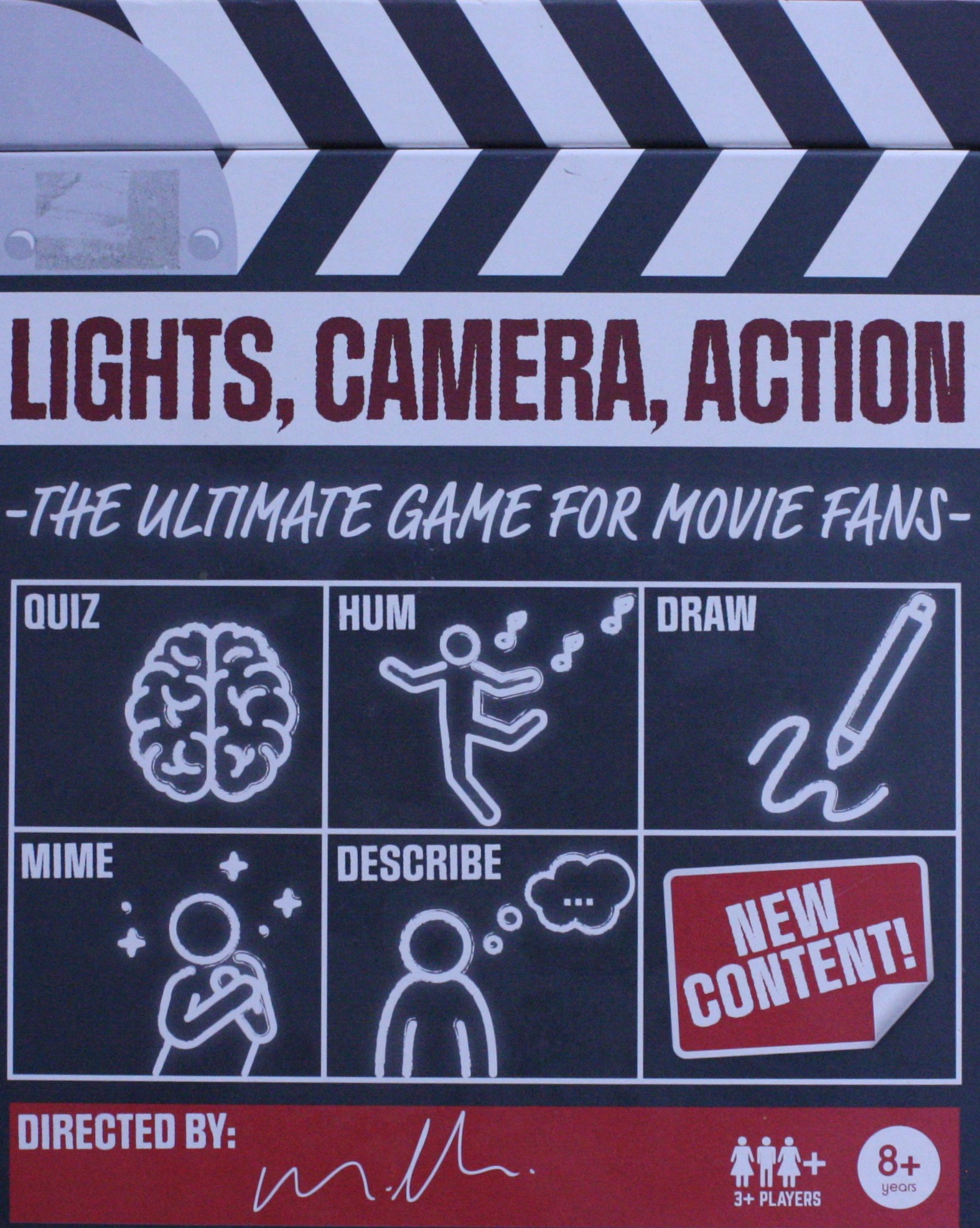 Lights, Camera, Action comes packaged in a neat clapperboard style box and includes 50 x question cards, a notepad, pencil, and dice.
